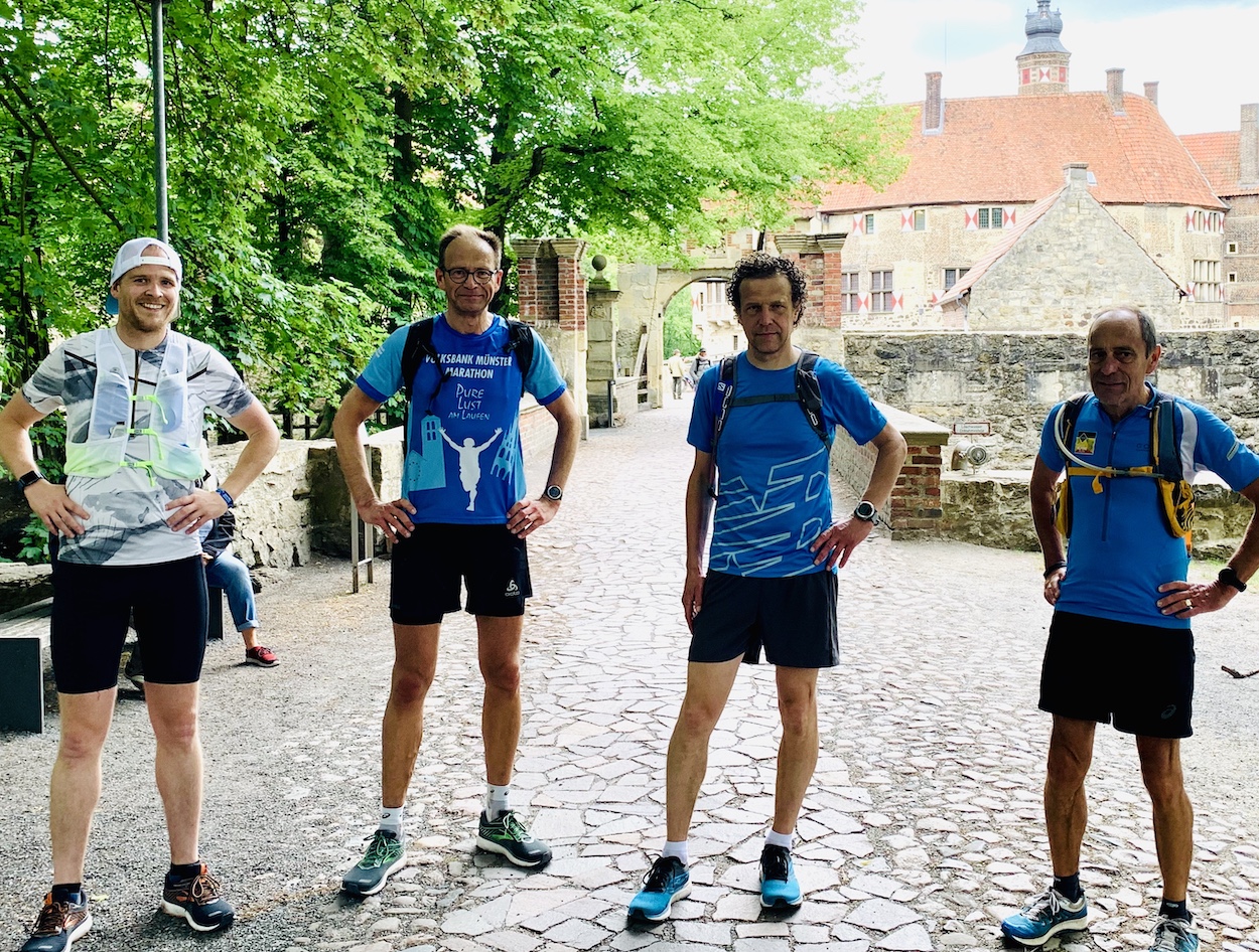 Julian Wienhölter, Christoph Schlütermann, Karl Berndstrotmann und Jürgen Bathen gingen über die 42,195 Kilometer an den Start, Silvia Rusche und Matthias Stobbe hatten sich den Halbmarathon vorgenommen. Gemeinsam ging es über die Kleelattroute von der Burg Vischering bis zur Verpflegungsstation des DRK an der Rettungswache in Senden (km 17).  Danach sind Rusche und Stobbe abgebogen und hatten ihren Halbmarathon erfolgreich absolviert. Die anderen sind die Kleeblattroute voll durchgelaufen. Die Zeiten  standen dabei nicht im Mittelpunkt, obwohl sich ein Ergebnis von knapp über vier Stunden sehen lassen kann. Die gelaufenen Zeiten und Strecken musste jeder Teilnehmer online an die Veranstalter senden. Da das Anmeldefenster schon geschlossen war, hatten sich Julian Wienhölter und Christoph Schlütermann spontan entschlossen, ihre Freunde zu begleiten. Gemeinsam macht es doch mehr Spaß. Es war ein tolles Erlebnis, nach über zweimonatiger Kontaktreduzierung endlich mal wieder gemeinsam mit den Sportkameraden des Lauftreff Lüdinghausen eine solche Herausforderung zu bestehen. Die Strecke, das bestätigen alle Teilnehmer, ist für Naturliebhaber und landschaftlich Interessierte ein echtes Highlight. Waldwege, Moore, Burganlagen, historische Stätten, wie der Ort, an dem Lambert von Oer mit dem berühmten Halsband kämpfte, Kanalseitenwege - alle im Topzustand - Flüsse und immer wieder Höfe, Bildstöcke und kleine Kapellen. Sportlich sind alle gesund und fit, aber auch ein wenig erschöpft ins Ziel gekommen.