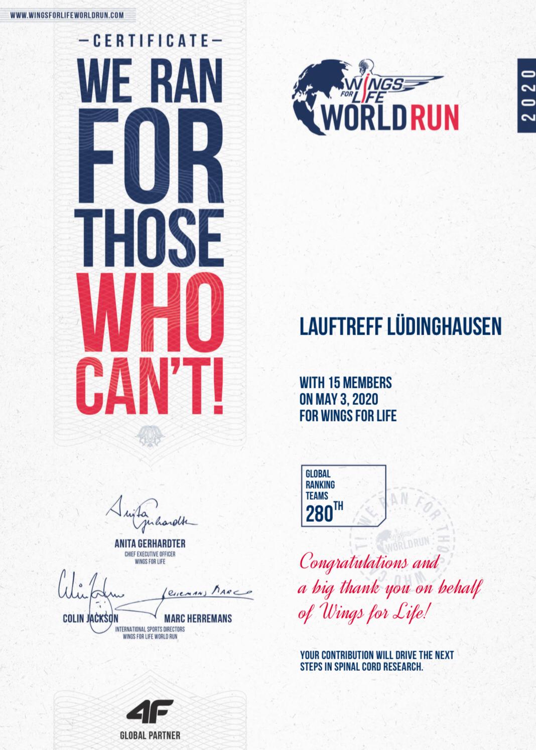 In Coronazeiten ist es schwer, die Motivation an der Lauflust und besonders die der schnellen Trainingseinheiten aufgrund der fehlenden und abgesagten Wettkämpfen hochzuhalten. Vom Bambini-Lauf, über die Volksdistanz 10km bis hin zu Ultraläufen oder Spendenläufen ist jedes Event (darunter auch viele Marathon- oder lokale Wettkampfveranstaltungen) mindestens bis zum 31. August abgesagt. Doch der Lauftreff Lüdinghausen hatte Tipps und Tricks für seine Läuferinnen und Läufer auf Lager. Der alljährliche Wings for life run (WfLr) findet als internationales Laufevent auf der gesamten Welt statt, ist der Rückenmarkforschung gewidmet und überweist das Startgeld jedes Teilnehmers in Höhe von 20 Euro zu 100 Prozent an diesen Forschungszweck. Das besondere Laufformat an diesem Event ist, dass es keine vordefinierte Streckenlänge gibt. Auf der App der Veranstaltung wurde weltweit um 13:00 Uhr MEZ am Sonntag, 3. Mai, der Lauf gestartet und per GPS die Strecken gemessen. Alle Läuferinnen und Läufer, vom Einsteiger, Amateur, ambitioniertem Läufer sogar bis hin zur Elite sind bei dem Event alljährlich dabei aufgrund der aktuellen Lage, allerdings unter besonderen Voraussetzungen. So läuft man bei dem WfLr in diesem Jahr auf einer virtuellen Startlinie los und läuft seine eigens gewählte x-beliebige Strecke. Nach 30 Minuten Laufzeit startet ein virtuelles „Catchcar“ mit zunächst 14 km/h, welches immer mehr an km/h zunimmt und die Starterinnen und Starter in versetzten, zeitlichen Abständen einfängt. Der Aufruf in diesem Jahr führte zu einem Starterfeld von über 77.000 Teilnehmerinnen und Teilnehmern, darunter auch  Athleten aus  Lüdinghausen. Zufällig trafen sich der Eine oder die Andere während des Wettkampfes auf verschiedenen Kursen rund um Seppenrade und Lüdinghausen. In der Teamwertung belegte der Lauftreff Lüdinghausen international Platz 280 (von weltweit 3050 Teams) mit 247,33 zurückgelegten Kilometern, einer Durchschnitts Distanz von 17,67 km und einer Teilnehmerzahl von 14 Personen. In der Einzelwertung kamen die heimischen Starter auf folgende Distanzen, bis einen das Catchcar einholte: Petra Göldner (Rückwärtsläuferin) wurde nach 7,89 km eingefangen, Monika Huesmann nach ca. 11 km, Andrea Dabrowski erlief 11,98 km, Dirk Lagers 13,29 km, Patrick Holtrode joggte eine Distanz von 13,29 km, Matthias Kleinert 18,68 km, Matthias Stobbe rannte 19,74 km, Jan Stork 22 km, Christoph Schlütermann sowie Lena Markfort finishten den HM mit 21,1 km, Triathlet Frank Göldner joggte 23,64 km, Richard Deters 25,93km, Magnus Nibbenhagen mit persönlicher längster je gelaufener Distanz 27,42 km, Andreas Koch sowie Linus Nibbenhagen finishten bei 35,47 km.  Der „global Winner“ des Events legte 69,9 km zurück, bevor ihn das virtuelle Auto einholte, die „global Winnerin“  konnte mit 54,23 zurückgelegten Kilometern den Sieg für sich entscheiden. Einzelheiten zu den Ergebnissen und Informationen zu dem Lauf sind unter: https://www.wingsforlifeworldrun.com/de zu finden.