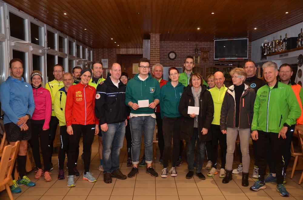 Es muss den über 100 Teilnehmern am Silvesterlauf des Lauftreffs Lüdinghausen gut geschmeckt haben, als sie im Anschluss an die sportliche Tätigkeit mit Plätzchen, Kuchen,Glühwein und Punsch verwöhnt wurden. Denn das Spendenschwein des Lauftreffs war gut gefüllt. 300 Euro überreichte der Lauftreff nun zu gleichen Teilen an Ruth Middrup von der Leichtathletikjugend des SC Union 08 für bestimmte Aktionen in der Saison, sowie an Ole Jünemann, Lea Westrup und Christian Boländer für das Jugendrotkreuz des Ortsverbandes Lüdinghausen-Seppenrade, die das Geld in die Ausstattung des Jugendraumes und zur Anschaffung neuer Sweatshirts für den DRK-Nachwuchs stecken wollen.