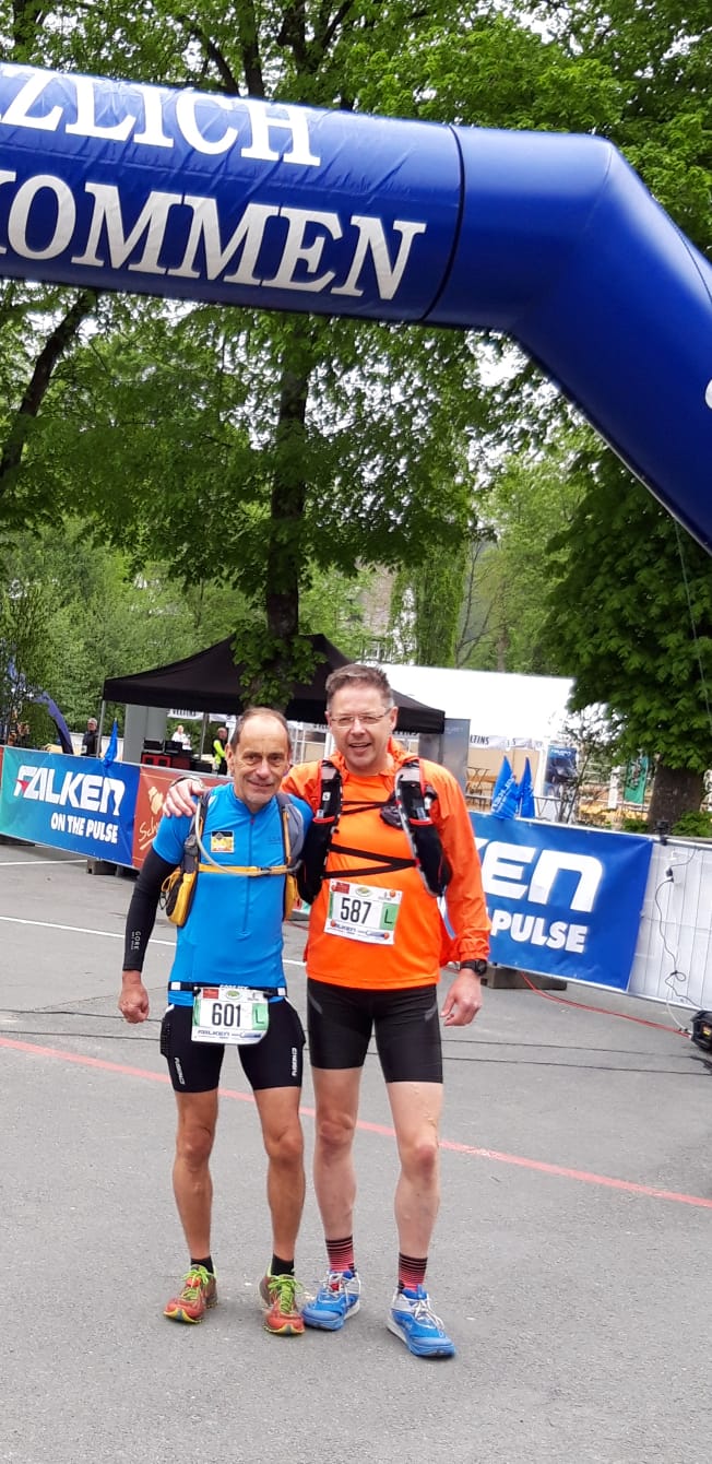 Der Bödefelder Hollenlauf ist eine Veranstaltung, die jedem der ca. 2100 Wanderer und Läufer auf unterschiedlichen Streckenlängen ein außergewöhnliches Lauferlebnis verspricht. Karl Berndstrotmann vom Lauftreff Lüdinghausen und Klaus Surland aus Senden ( Laufsport Senden ) ( Foto ) hatten sich für die 55km Strecke durch das Sauerland entschieden. Nach einem ausgiebigen Frühstück in der Schützenhalle von Bödefeld erfolgte der Start um 10:00 Uhr . Jetzt lag die Temperatur noch bei idealen 15 Grad. Im Laufe des Rennens wurde es jedoch immer wärmer. Auf den ersten 5 km ging es stetig bergauf um dann nach ca. 10 km wieder Bödefeld zu erreichen. Hier führte die Strecke dann steil hoch zum Kreuzberg. Oben angekommen ging es wieder runter ins Tal. Als nächste große Herausforderung war dann der Skihang der Hunau zu bewältigen. Da bei dieser extremen Steigung an Laufen nicht mehr zu denken war, hatte man jetzt die Gelegenheit  die tolle Landschaft des Sauerlandes zu genießen. Nach einigen bergauf - und bergab –Passagen, wartete schon der Gipfel des Kahlen Astens. Auch hier ging es steil die Skipiste hoch. Bei Lenneplätze ( km 40 ) war dann endlich der Wendepunkt der 55 km Strecke erreicht. Jetzt ging es 15km zurück. Schwierig waren mittlerweile die steilen Bergab Passagen. Immer wieder gab jedoch auch herrliche Aussichten zu bestaunen. Nach 5:33 Std. waren die 55,7 km mit 1218 Hm überstanden. Das war für Berndstrotmann der 7. Platz in der Gesamtwertung und der 1 Platz in seiner AK  M 60. Den 2. Platz in der AK  M 60  belegte Klaus Surland in 6:25 Std. Beide waren zufrieden mit ihren Zeiten und berichteten begeistert von der tollen, aber anstrengenden,  Streckenführung.