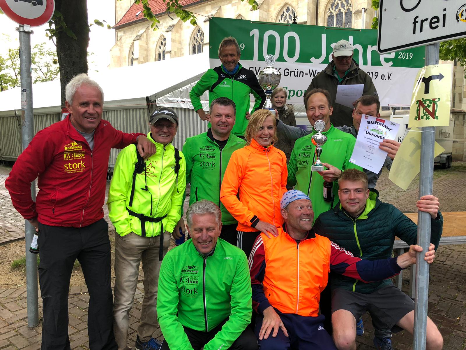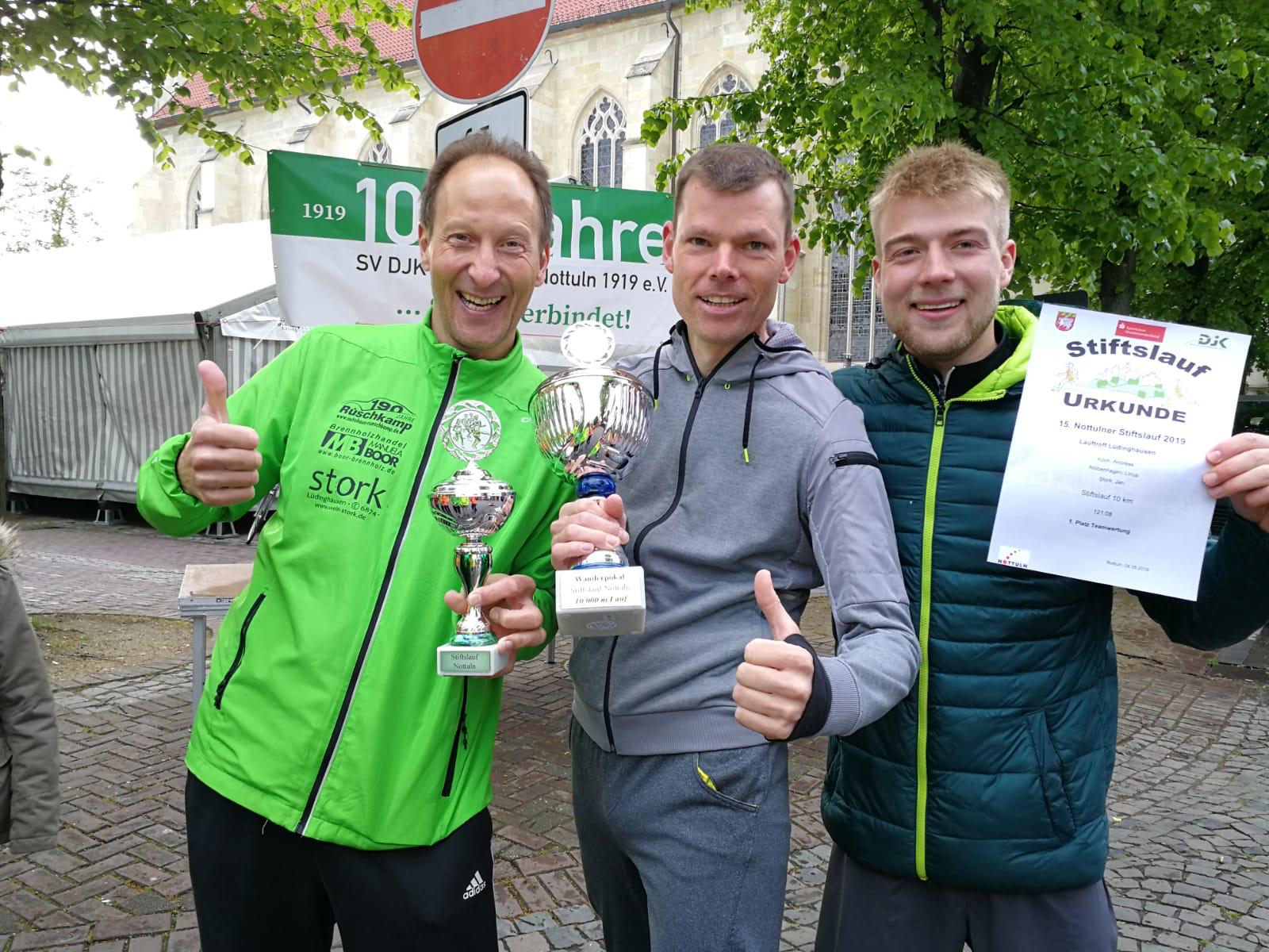 Der Lauftreff Lüdinghausen stellte beim 15.Stiftslauf in Nottuln das schnellste Team über die Königsdistanz von zehn Kilometern. Andreas Koch (li., 38:41 min., Rang 12), Linus Nibbenhagen (re., 39:31 min., Rang 18) und Jan Stork (42:56 min., Platz 27 und persönlicher Bestzeit) nahmen vom Veranstalter GW Nottuln den Siegerpokal und den großen Wanderpokal entgegen, der im kommenden Jahr dann zu verteidigen gilt. Fast 200 Teilnehmer waren am Samstag auf der recht anspruchsvollen Strecke über zehn Kilometer am Start. Auch die Zeiten der anderen Starter aus Lüdinghausen konnten sich sehen lassen. So feierte Sassina Burmeister wieder den Altersklassensieg in  der AK W 55.